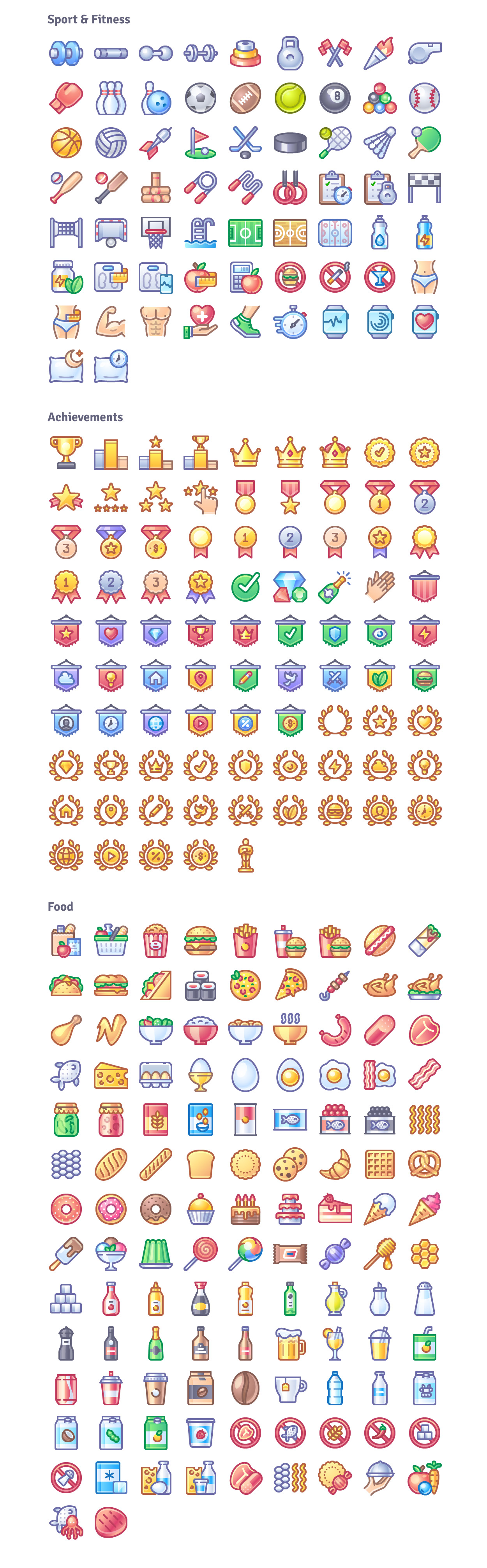 30 icon categories: Achievements, Advertisement, Appliances, Buildings, Business, Communication, Christmas, Database, Devices, Essentials, Finance, Finance Crypto, Food, Gestures, Halloween, Holiday & Party, Maps & Travel, Medicine, Nature, Office, People, Romantic, Security, Sport & Fitness, Symbols & Arrows, Technology, Tools, Transport, Weather.