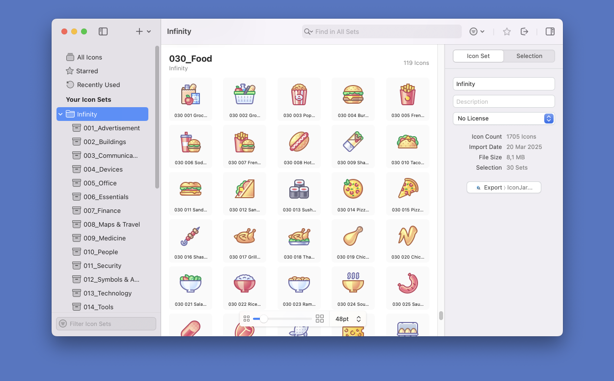 These icons are designed on a 48×48 sized pixel perfect grid to guarantee consistency and crisp look. All files are well structured and organized for better workflow experience.